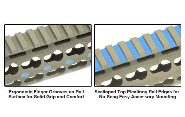 • Unique Scalloped Top Picatinny Rail Edges for No-snag Easy Accessory Mounting